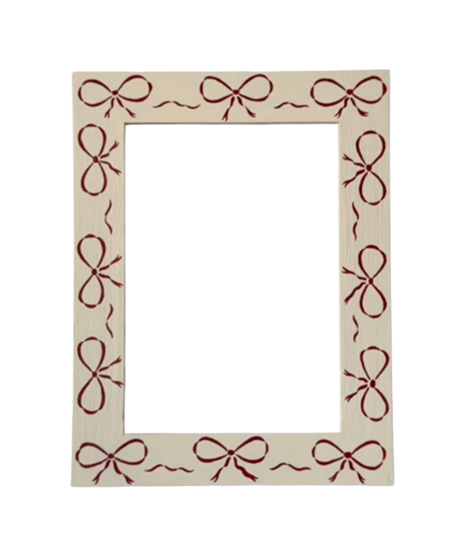 Hand-painted solid wood picture frame in ivory and with burgundy bows.