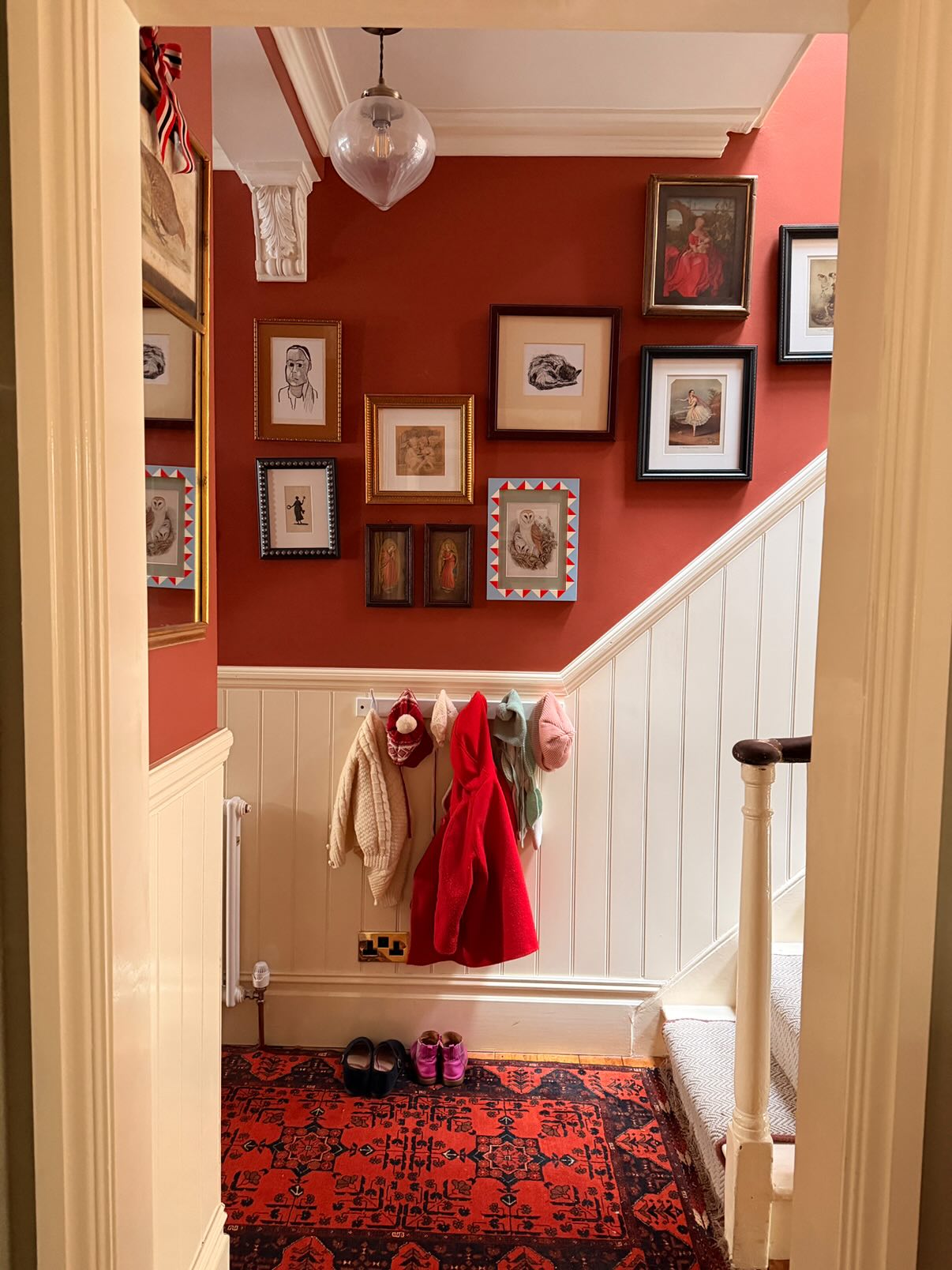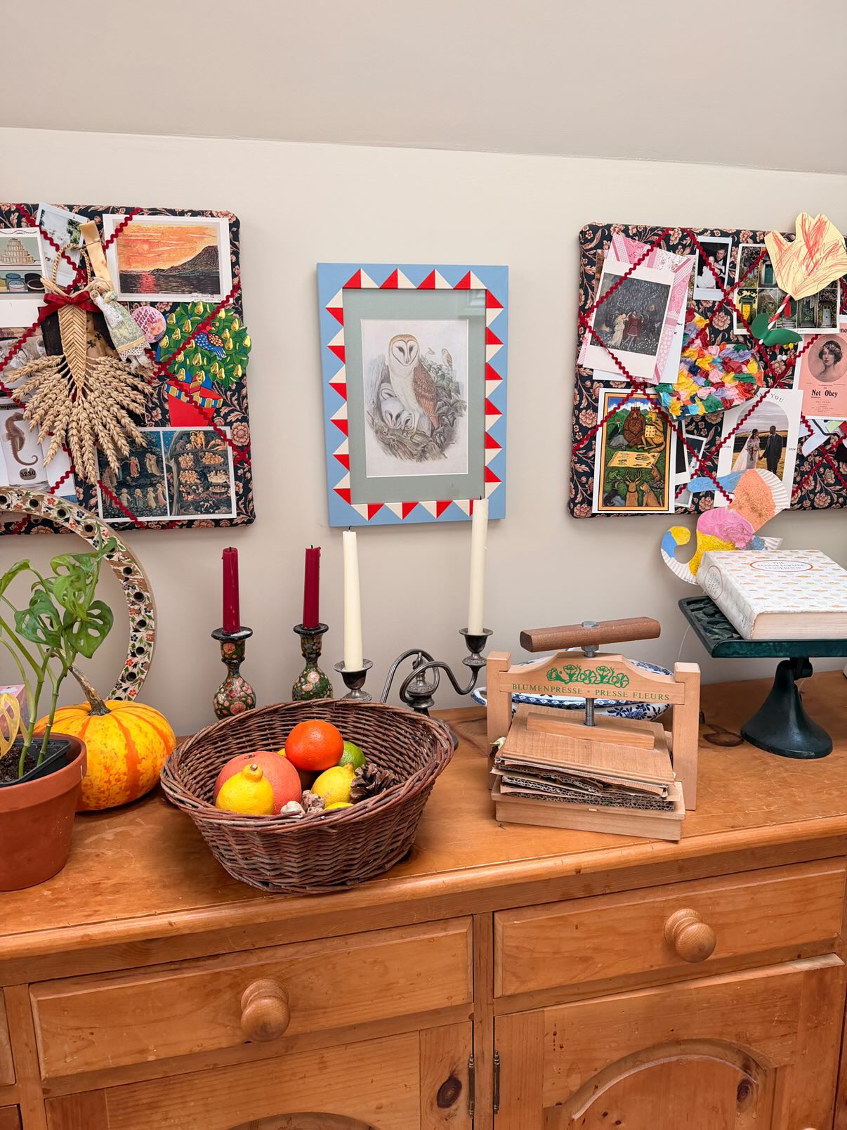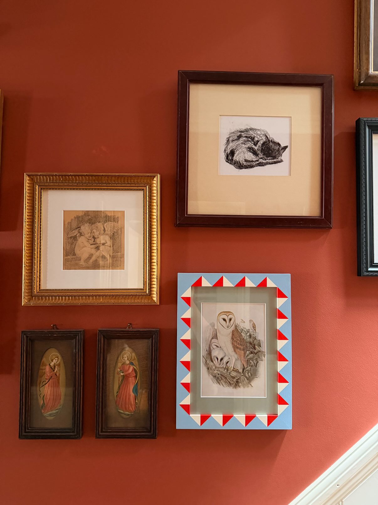 Hand-painted solid wood picture frame in baby blue, tomato red and cream.